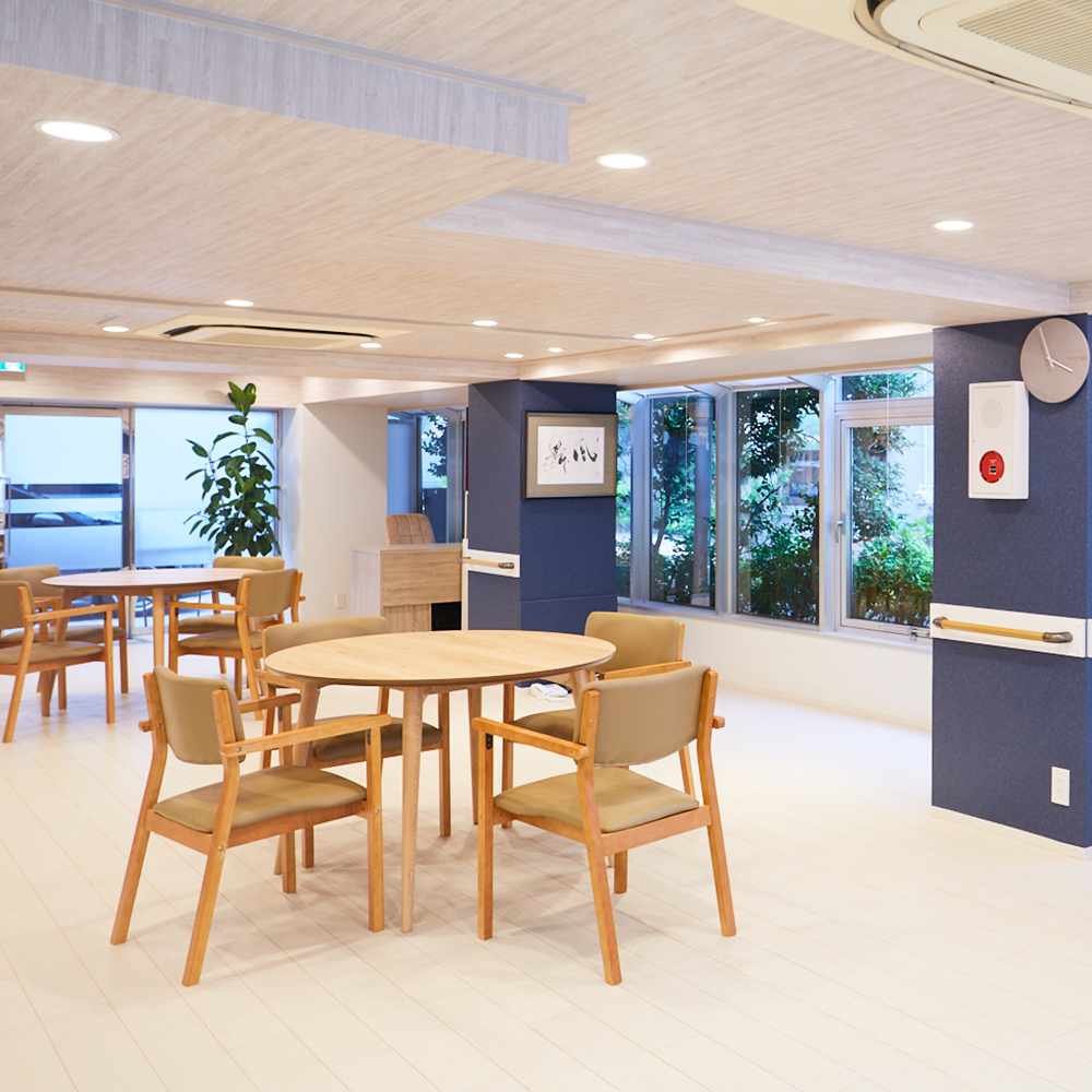 デイサービスクローバー芝公園は、「芝公園駅」から徒歩5分の場所に立地する建物の1階にあります。内装コンセプトは「書」。書道家としても活動しているクローバーのスタッフが書き上げた「書」作品が飾られています。